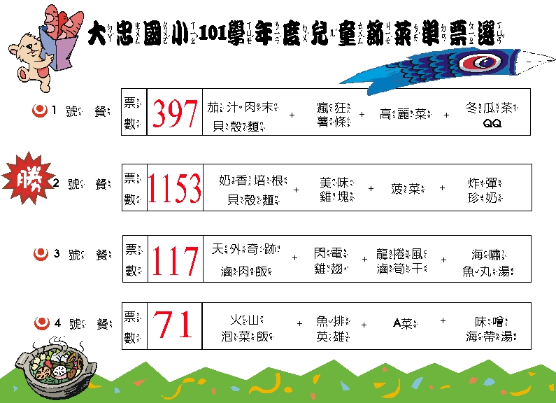 依據全校票選結果, 4/3〈三〉將供應得票數最高的
