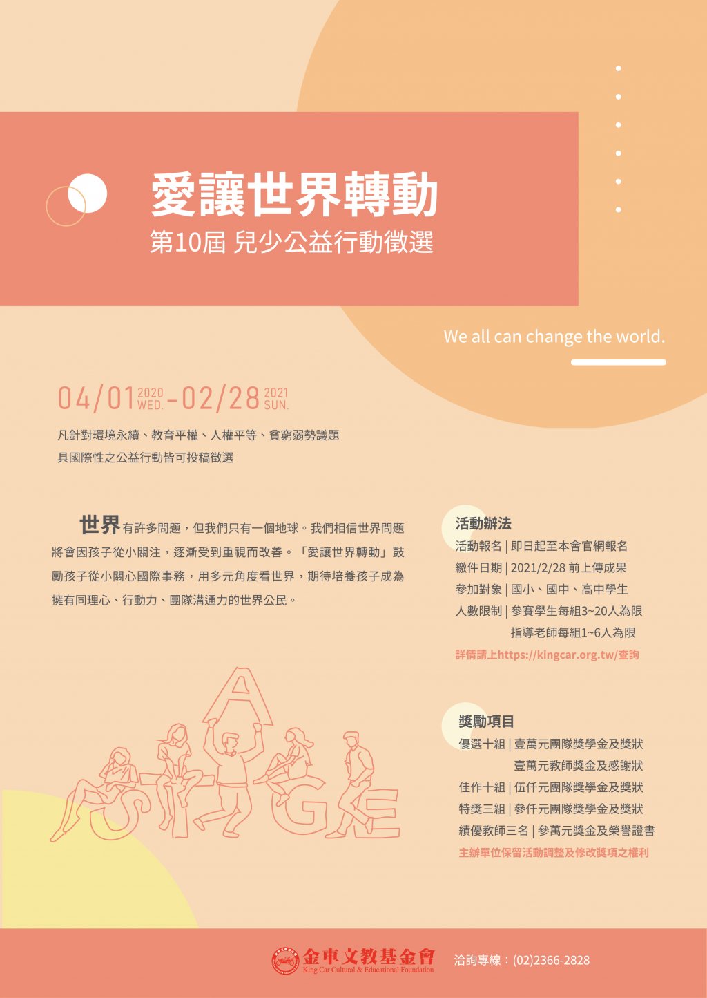 轉知金車文教基金會「愛讓世界轉動 兒少公益行動」2020 第十屆徵選簡章