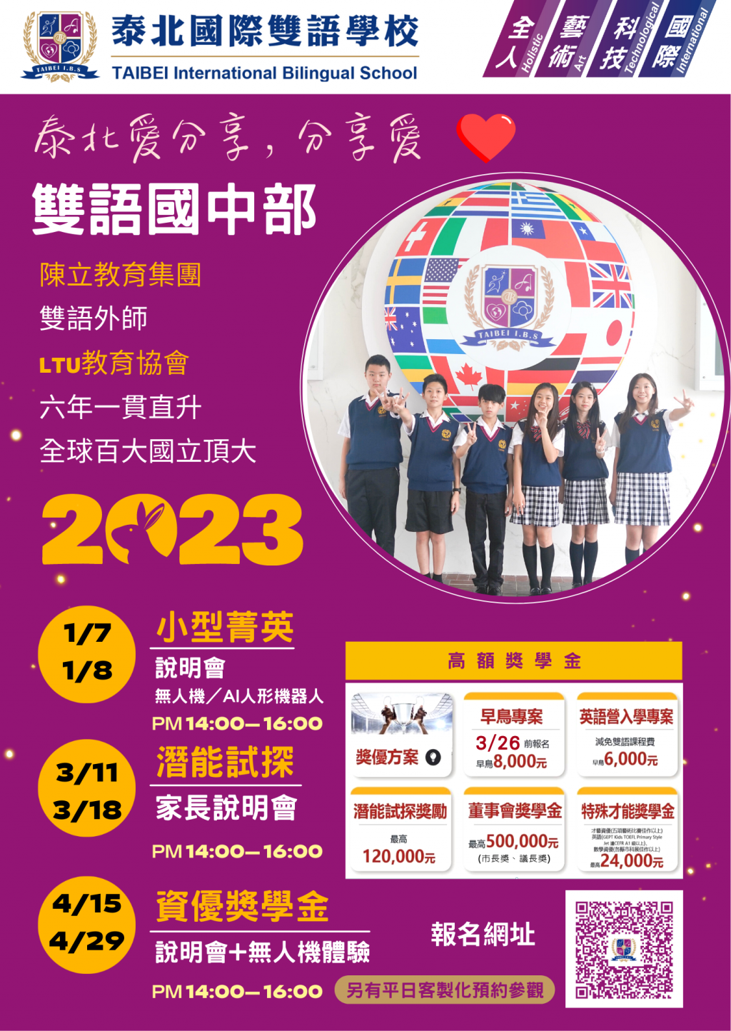 七、學習環境:本校雙語國中部,符應 2030 年雙語國家政策,業於 2022 年通過 ISA 國際學校獎中級認證,每週 8 節外師授課,與美國、加拿大、英國、日本簽訂雙聯學制等,致力培育國際人才。可申請住宿,亦歡迎外縣市學子報名。