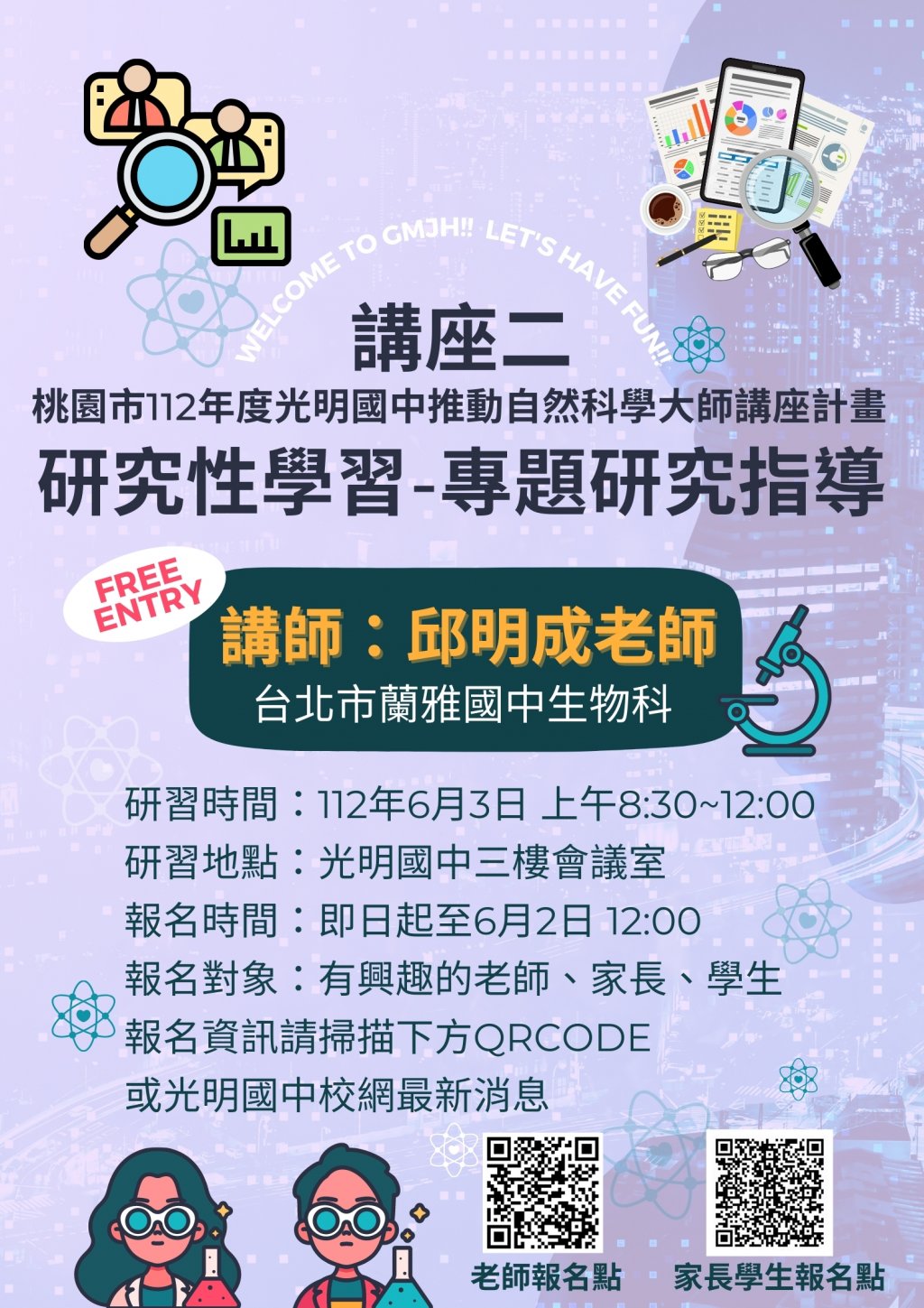 主旨: | 有關本校(光明國中)辦理桃園市 112 年度推動自然科學大師講座-場次二資訊,詳如說明,請查照。 |