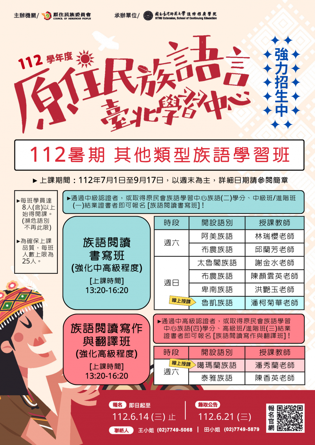 主旨: | 轉知國立臺灣師範大學辦理原住民族語言臺北學習中心 112 學年度暑期「其他類型族語學習班」課程資訊一案,詳如說明,請查照。 |
