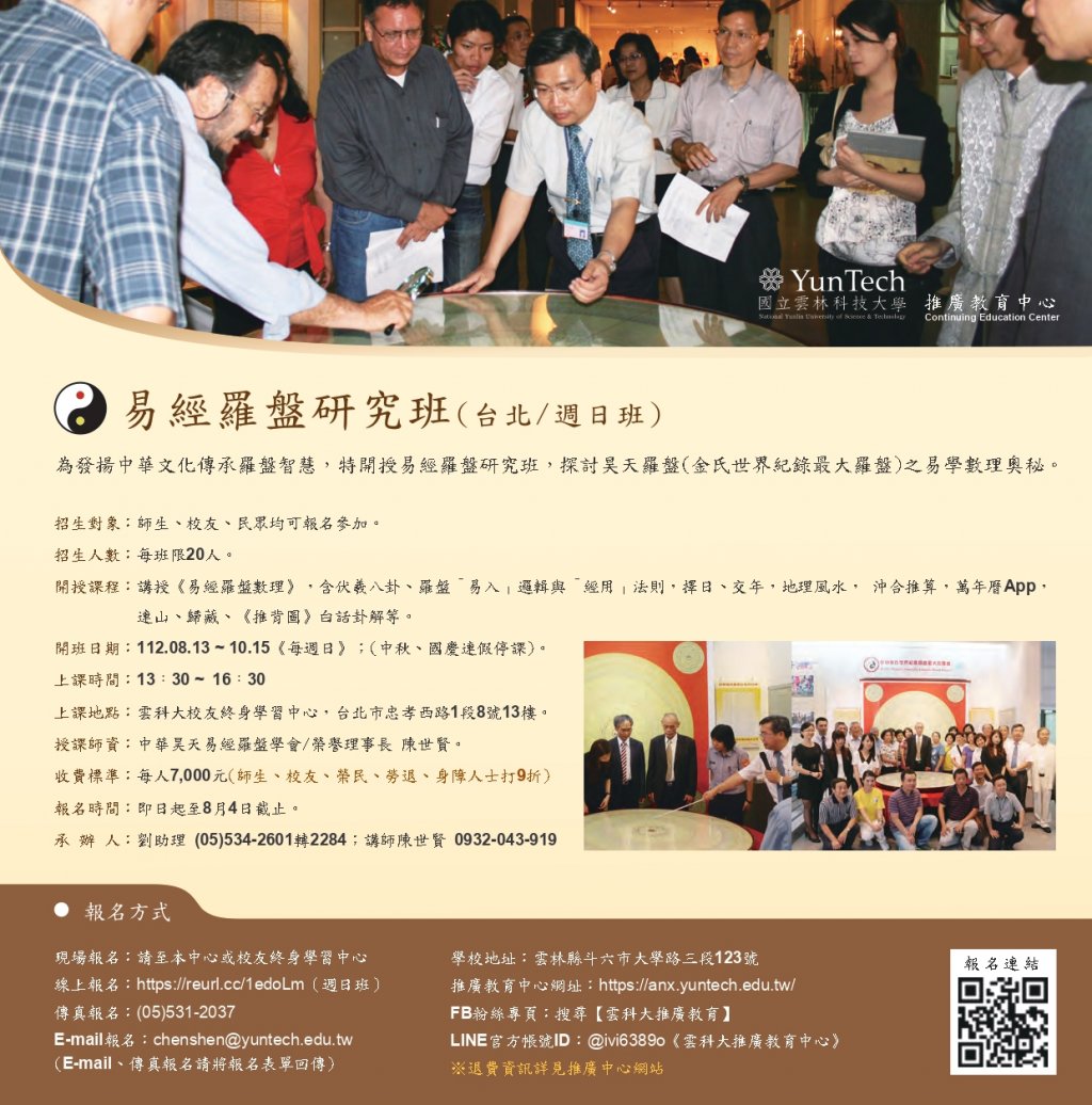 主旨: | 檢送國立雲林科技大學推廣教育「易經羅盤研究班」(台北班)報名表,請鼓勵貴屬員工參加研習,結業可登錄終身學習時數 24 小時,請查照。 |