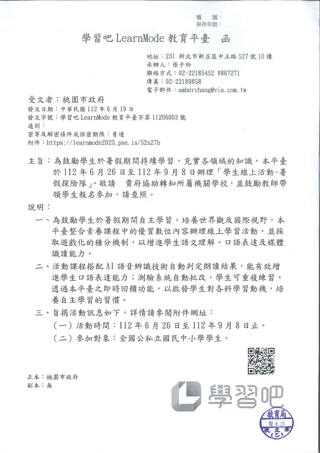 主旨: | 轉知有關學習吧 LearnMode 教育平臺辦理「學生線上活動-暑假探險隊」活動訊息,請查照。 |