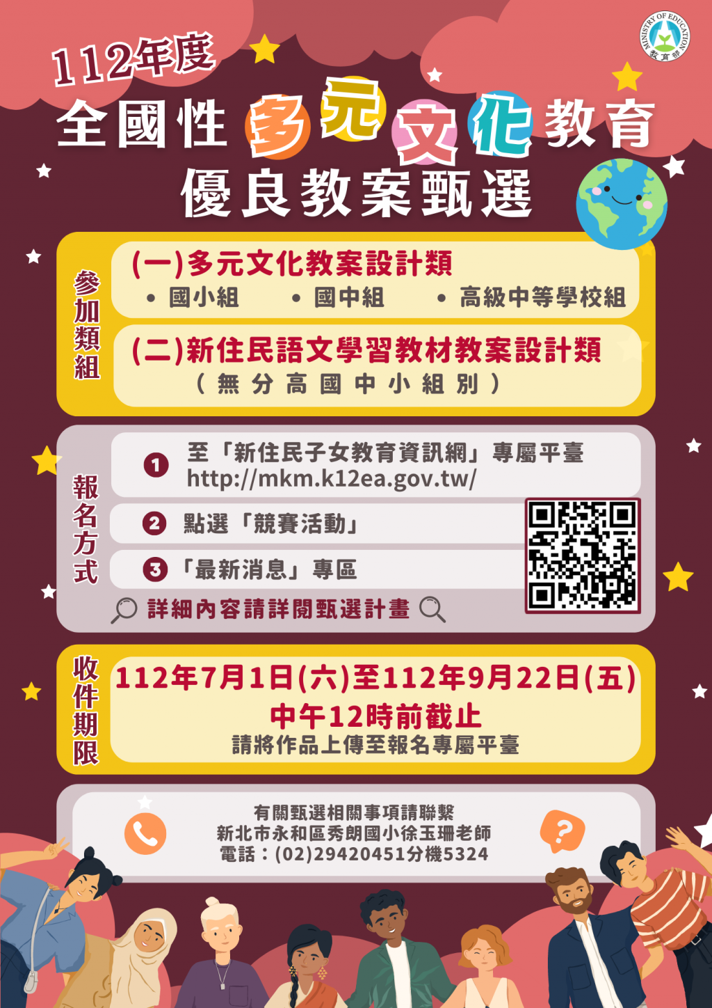 主旨: | 轉知教育部國民及學前教育署委請新北市政府教育局辦理「112 年度全國多元文化教育優良教案甄選」,請踴躍報名參加,請查照。 |