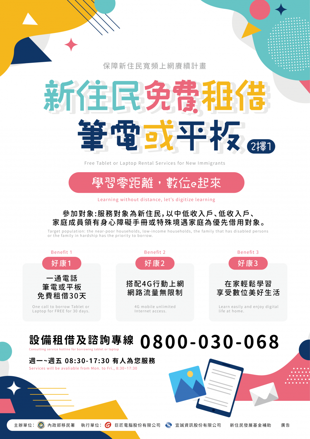 二、 | 即日起只要符合新住民身分者,撥打諮詢專線 0800-030-068 完成預約或至內政部移民署 25 個服務站洽詢申請,平板電腦或筆記型電腦立即宅配到府,並享有每月 4G 吃到飽行動網路;另若為低收入戶、中低收入戶、特殊境遇家庭或家中有身心障礙成員的新住民朋友,並能享有優先借用服務。 |
