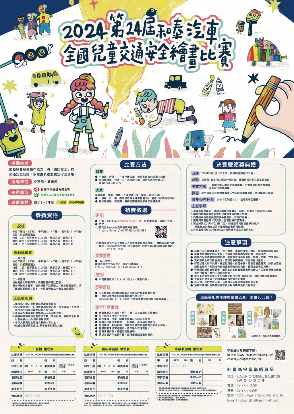 主旨: | 函轉財團法人純青社會福利基金會辦理「第 24 屆和泰汽車全國兒童交通安全繪畫比賽」活動訊息 1 份,請查照。 |