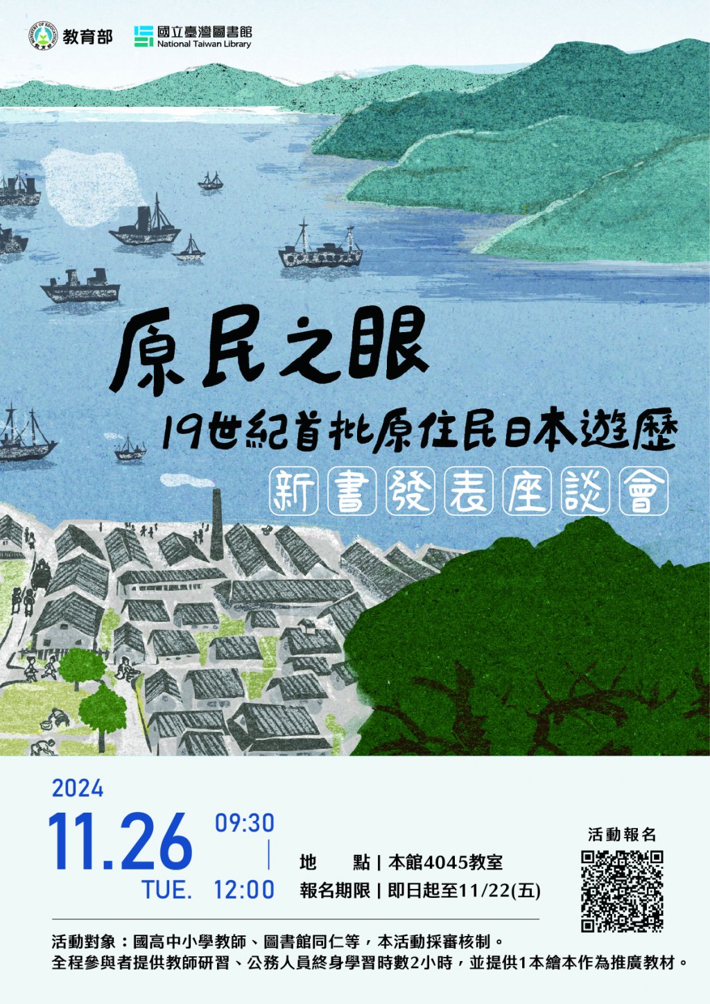 二、國立臺灣圖書館為推廣史料近用,將史料轉譯成繪本《原 民之眼: 19 世紀首批原住民日本遊歷》。繪本內容符合十 二年國民基本教育課程綱要,適合國小高年級社會課程、 國中歷史、高中歷史作為課程延伸閱讀素材。