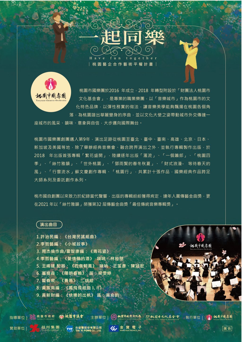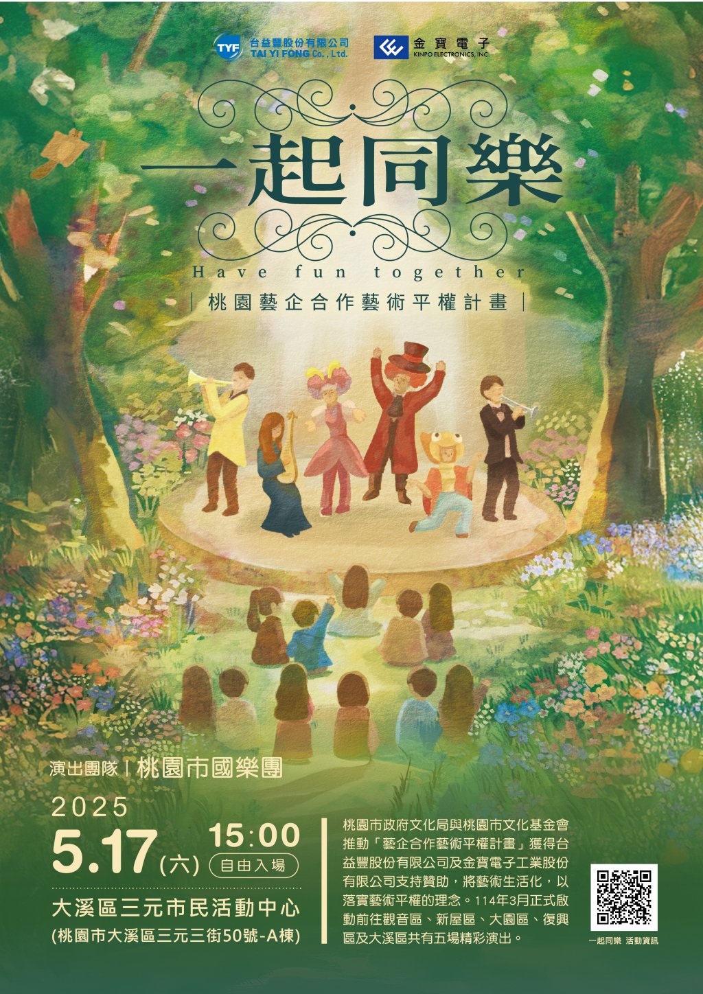 本活動預定於 114 年 5 月 17 日(星期六)下午 3 時,邀請「桃園市國樂團」於大溪區三元市民活動中心(桃園市大溪區三元三街 50 號-A 棟)辦理演出。