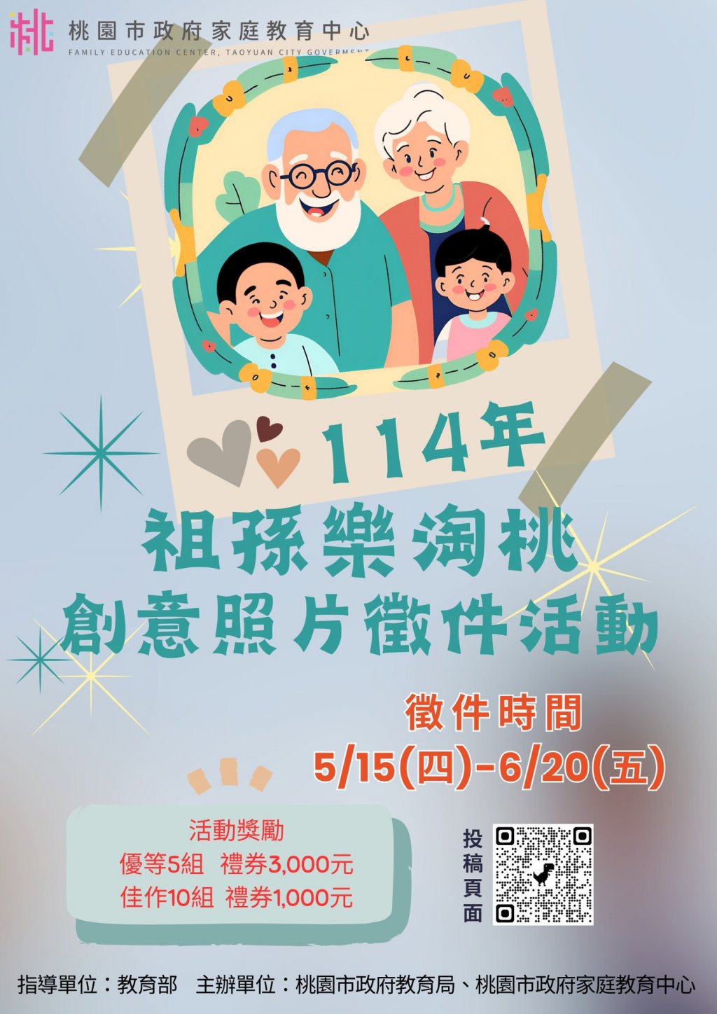 | 一、 | 「祖孫樂淘桃創意照片徵件活動」係鼓勵民眾紀錄祖孫互動的溫馨時光,徵件期限至 6 月 20 日(星期五)止,鼓勵民眾參加,獎項及獎品如下: |