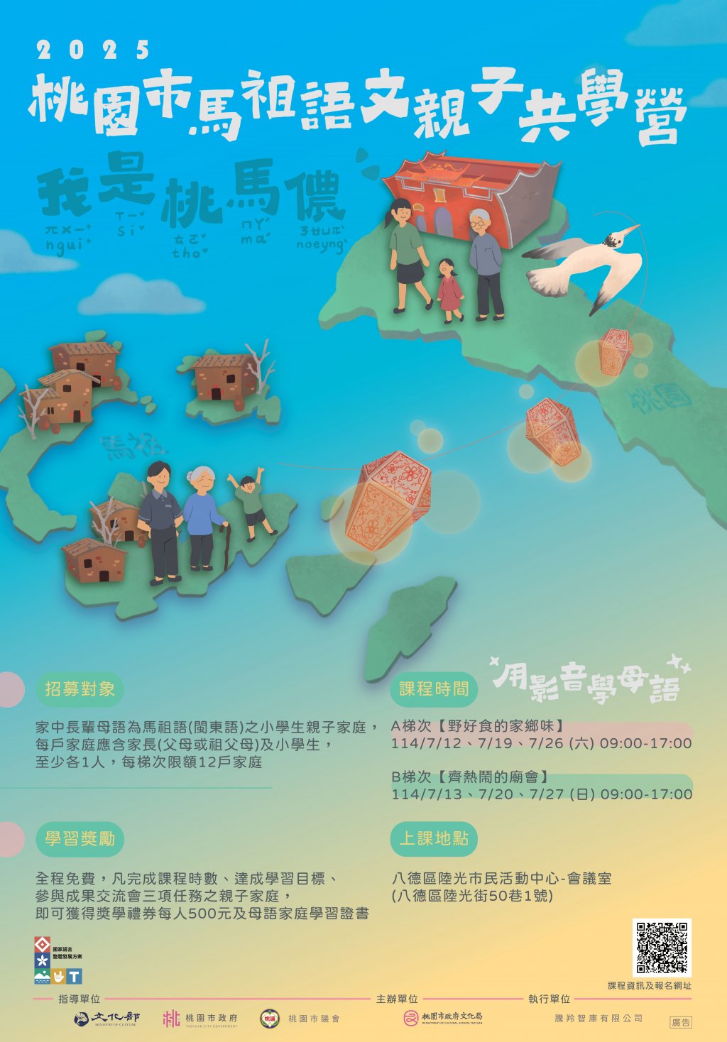| 一、 | 本市馬祖移民人口居全臺之冠,然馬祖語(閩東語)快速流失,面臨傳承危機,為推動本市馬祖語言文化永續發展,本局特於 114 年 7 月 12 日至 7 月 27 日假八德區陸光市民活動中心辦理兩梯次馬祖語文親子共學營,以本市馬祖後代小學親子家庭為招募對象,期透過親子共學推展母語家庭。 |