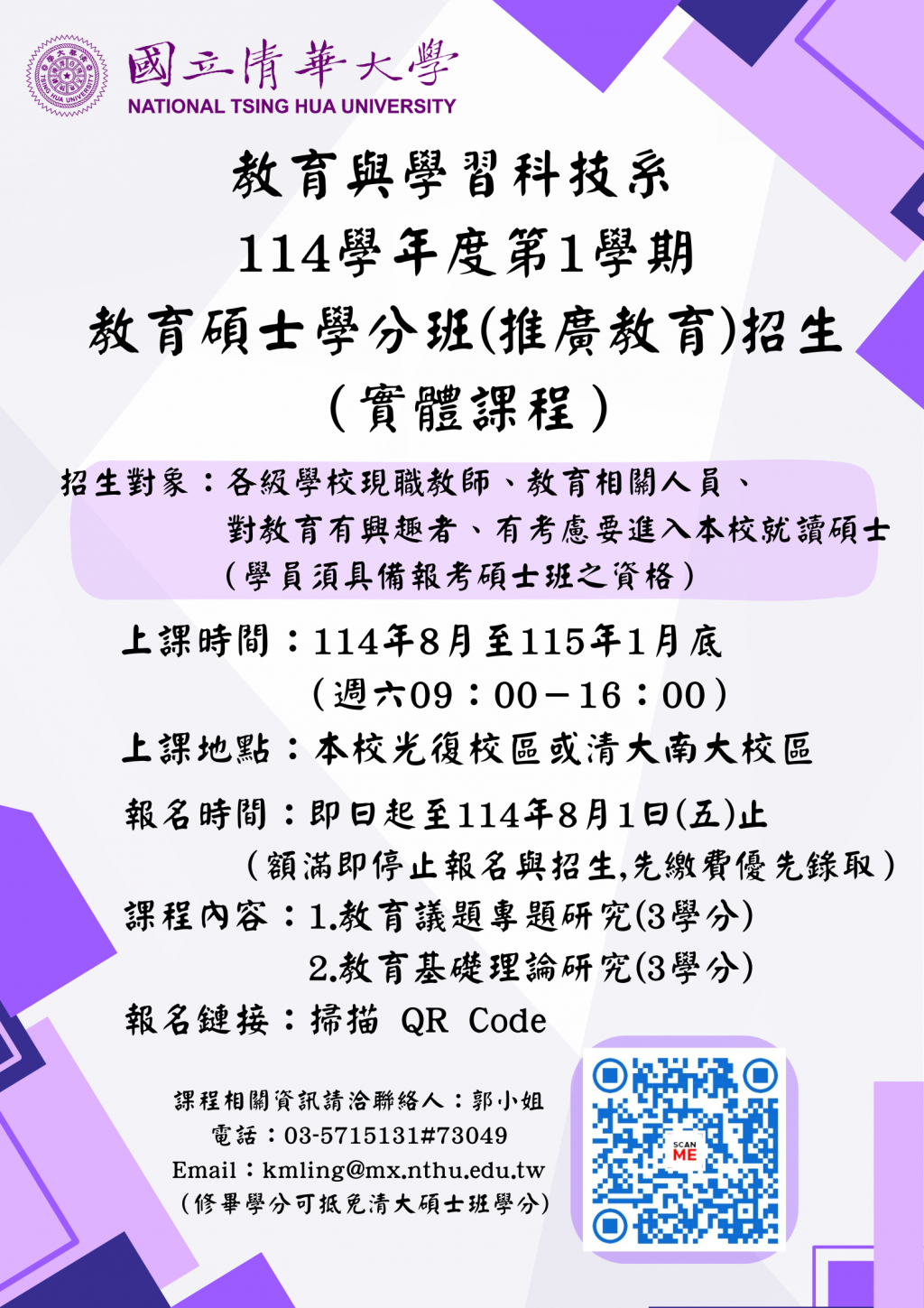 | 四、 | 相關訊息將公告於本校教育與學習科技學系首頁最新消息(網址: https://delt.site.nthu.edu.tw/),如有相關問題請洽郭小姐,聯絡電話: 03-5715131 分機 73049 ,電子信箱: kmling@mx.nthu.edu.tw 。 |
