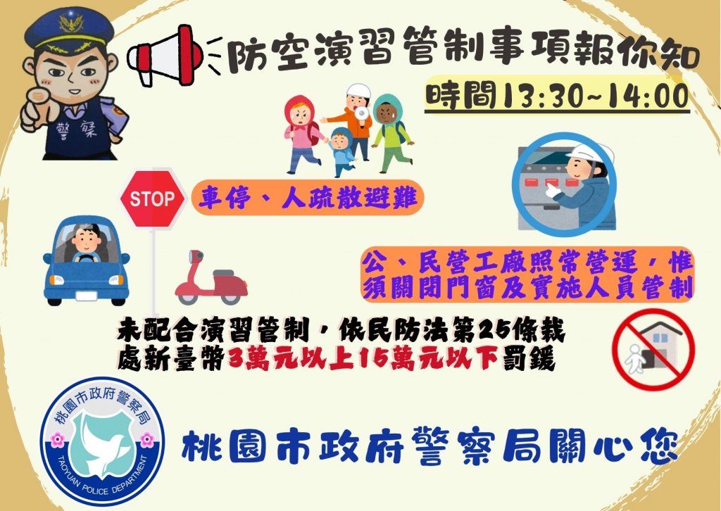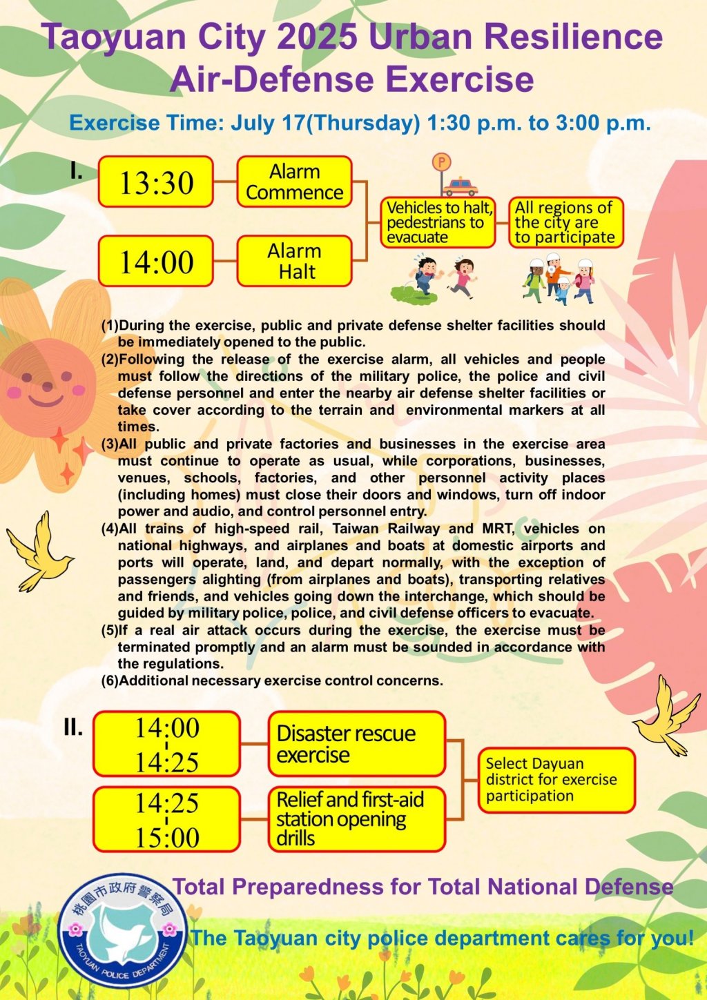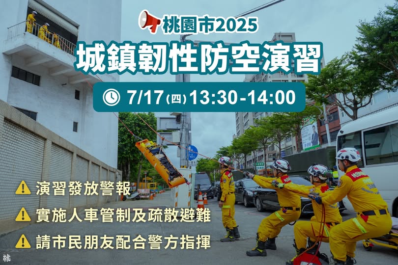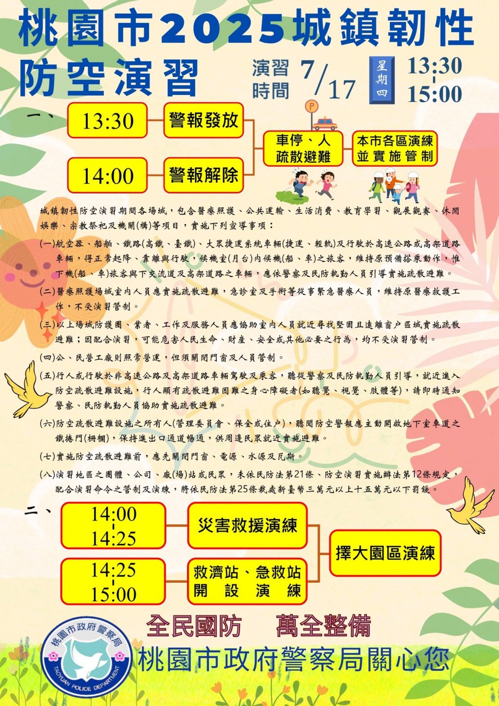桃園市將於 7/17 (四) 13:30 至 14:00 辦理,期間將發放警報、實施疏散避難及交通管制,請市民們配合演練。