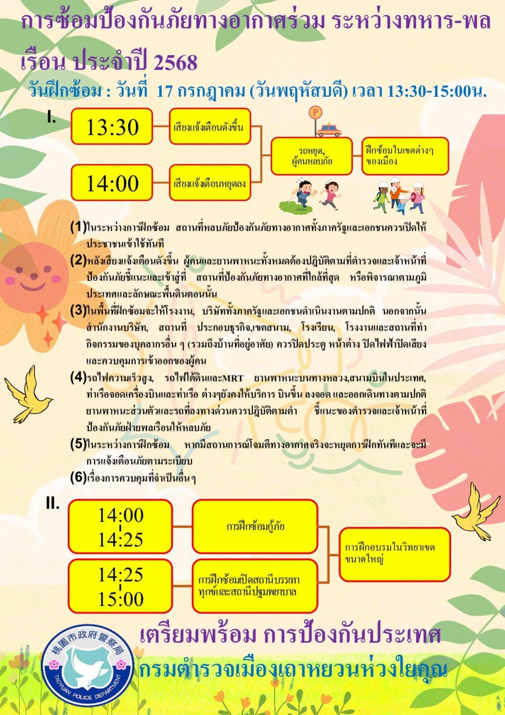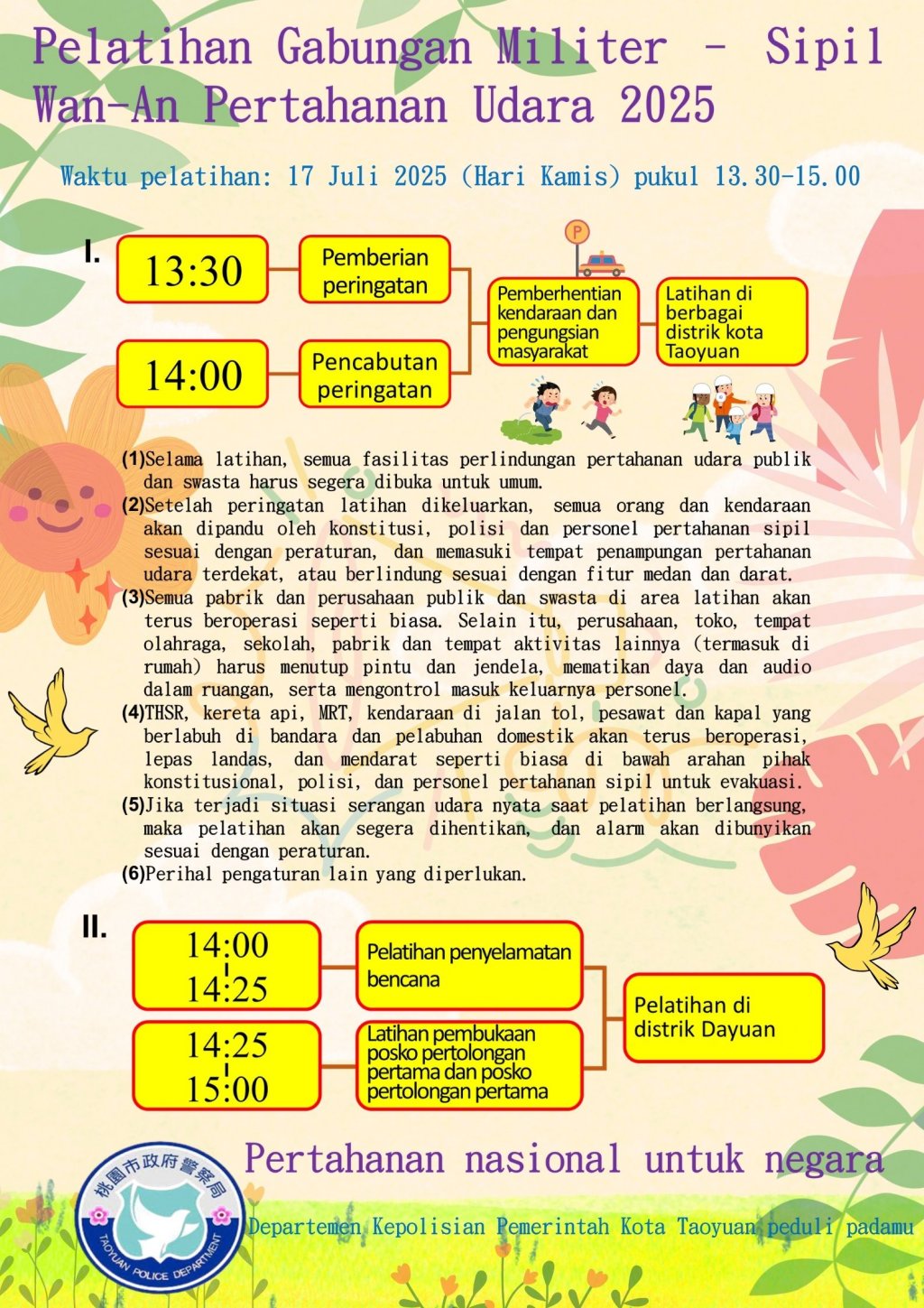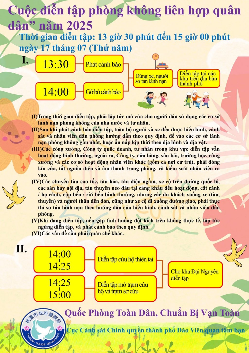 桃園市將於 7/17 (四) 13:30 至 14:00 辦理,期間將發放警報、實施疏散避難及交通管制,請市民們配合演練。