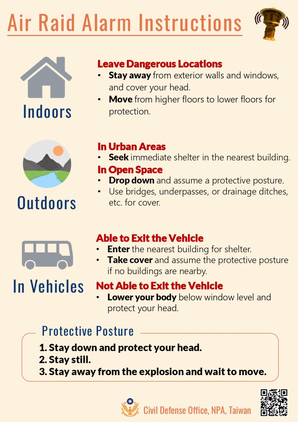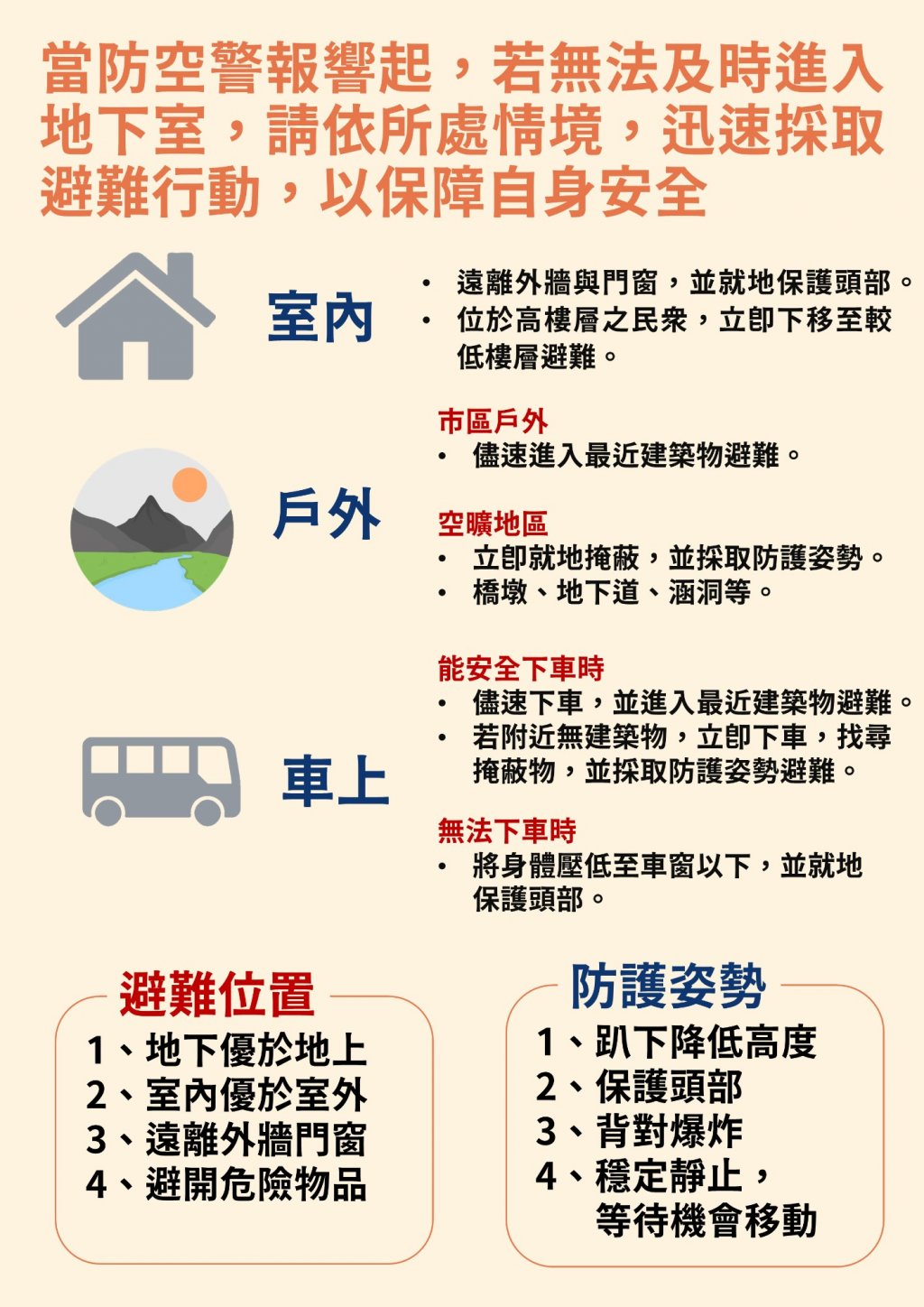 二、警報發放後請聽從指揮就近避難,車輛靠邊停並熄火,人員進入防空避難設施。