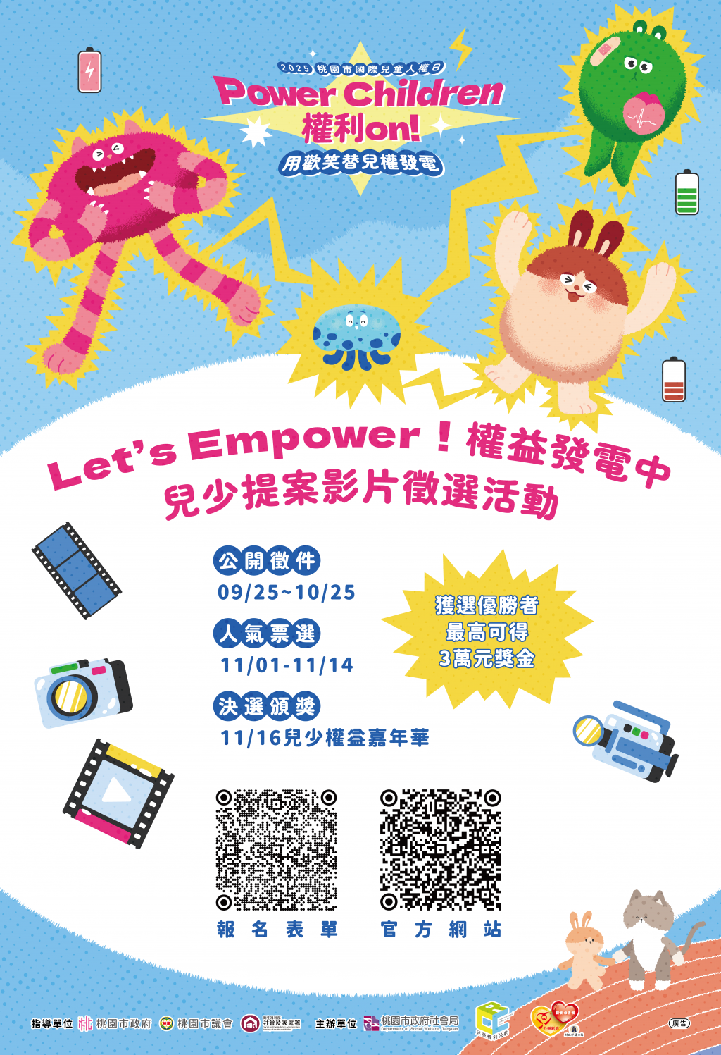 | 一、 | 為落實兒少表意及參與公共政策的權利,邀請設籍或實際居住桃園市或就讀桃園市學校 11 歲(含)以上至 18 歲以下兒少,針對兒童權利公約政策、法規運行或各類行政事務運作等事項,以拍攝影片的形式,提出檢討及策進,並邀請大眾關注此項議題。 |