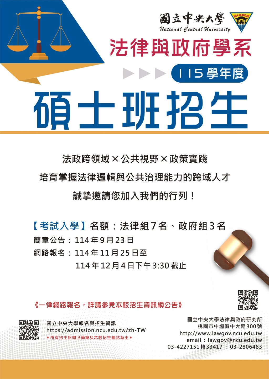 國立中央大學法律與政府學系「碩士班及碩士在職專班」115 學年度招生資訊。