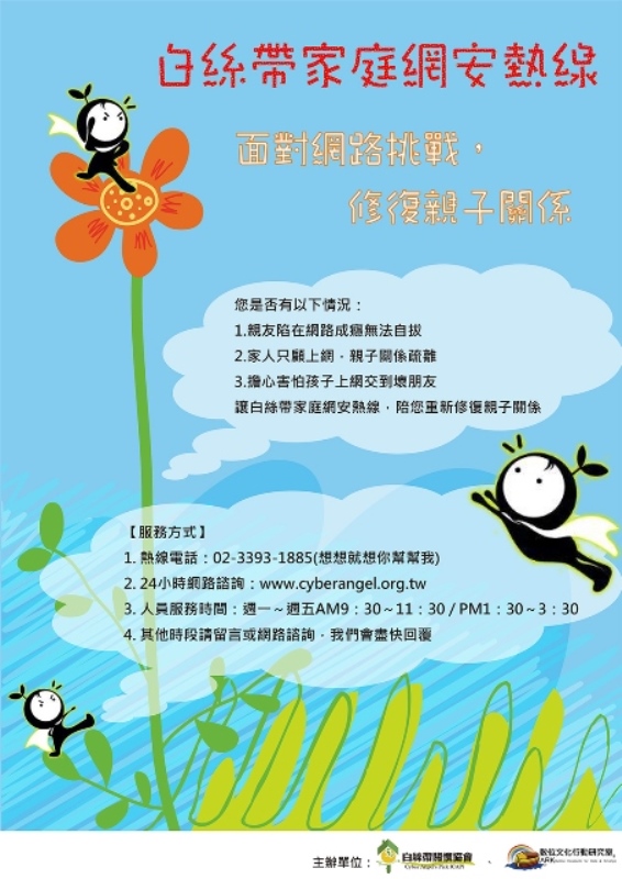 長對於上述兒少上網問題, 需要支持性的陪伴,因此中華白絲帶關懷協會於去( 101 )年 6 月成立「親職網安關懷熱專線」,期待關懷面臨以上問題的家長,提供親職諮詢等援助。
